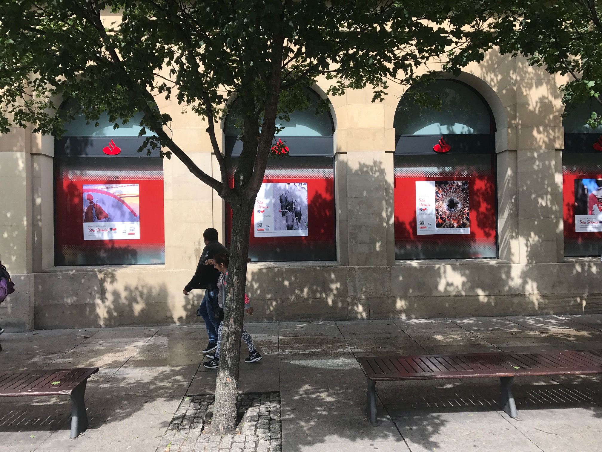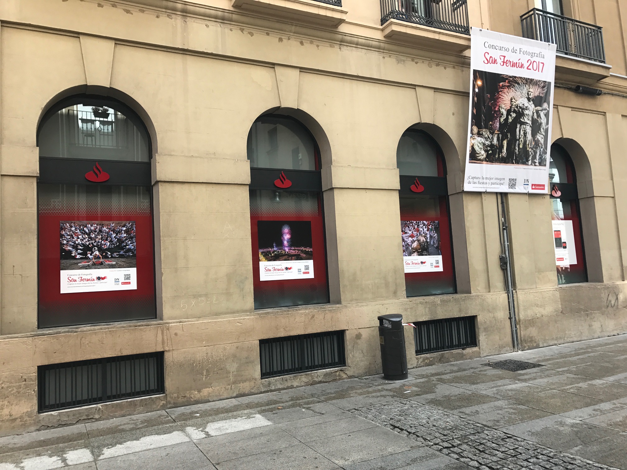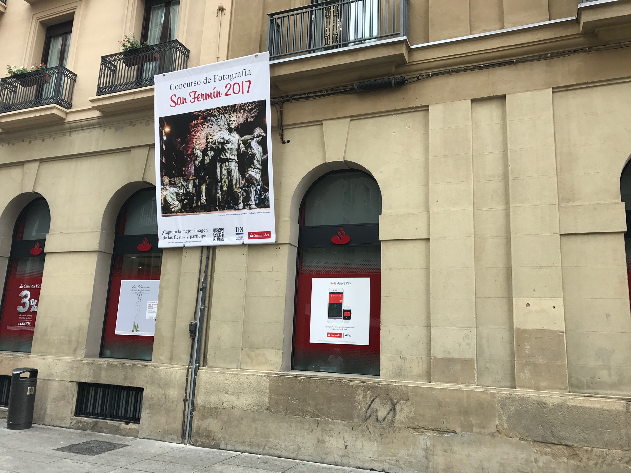 Ayer mismo estuvimos trabajando en el montaje de las lonas sobre bastidores metálicos y vinilos que anuncian el concurso y cómo participar. Como veis en las imágenes, visualmente es un elemento que destaca muchísimo en la fachada de las céntricas oficinas del Banco Santander en la Plaza del Castillo de Pamplona.